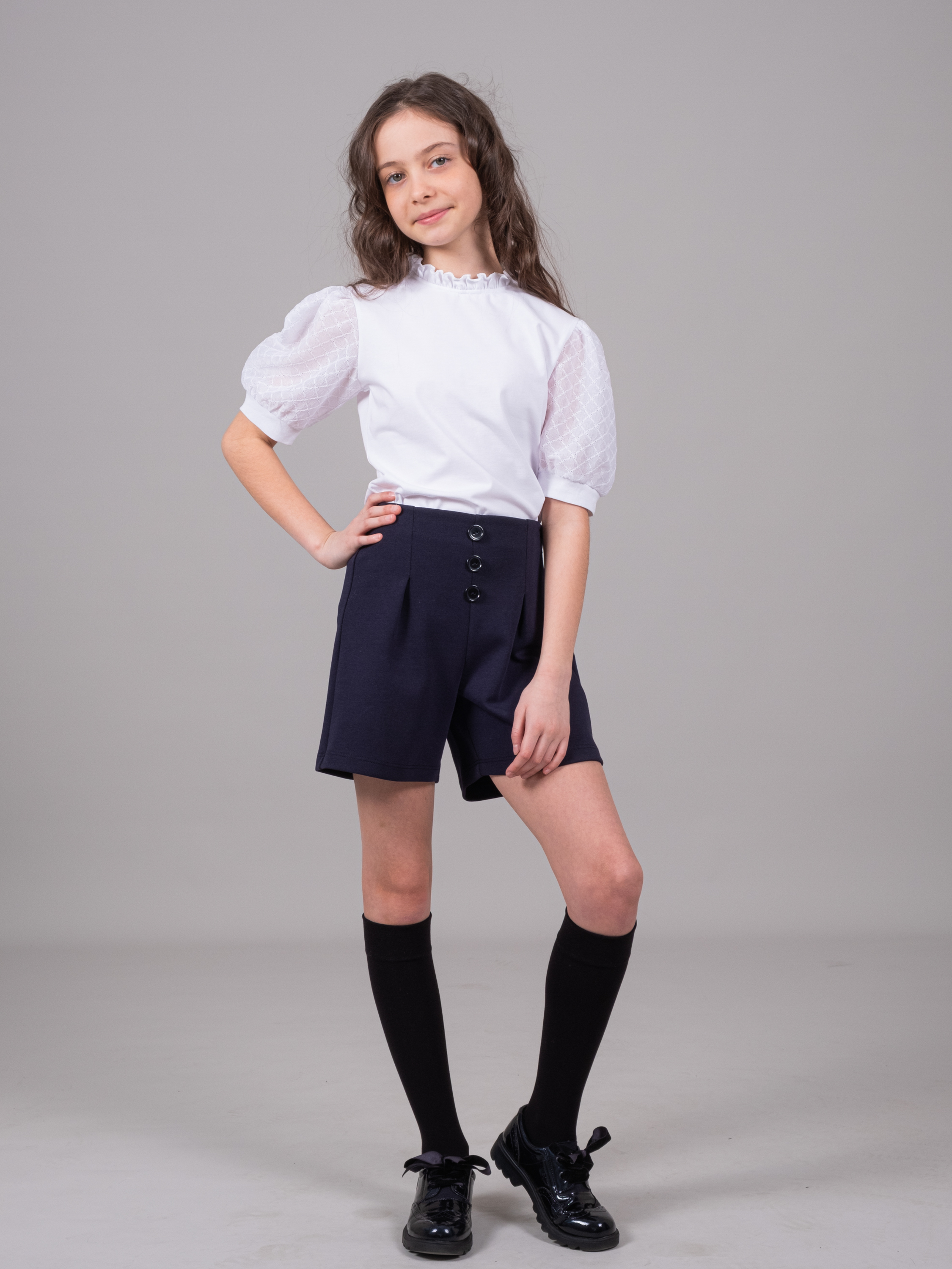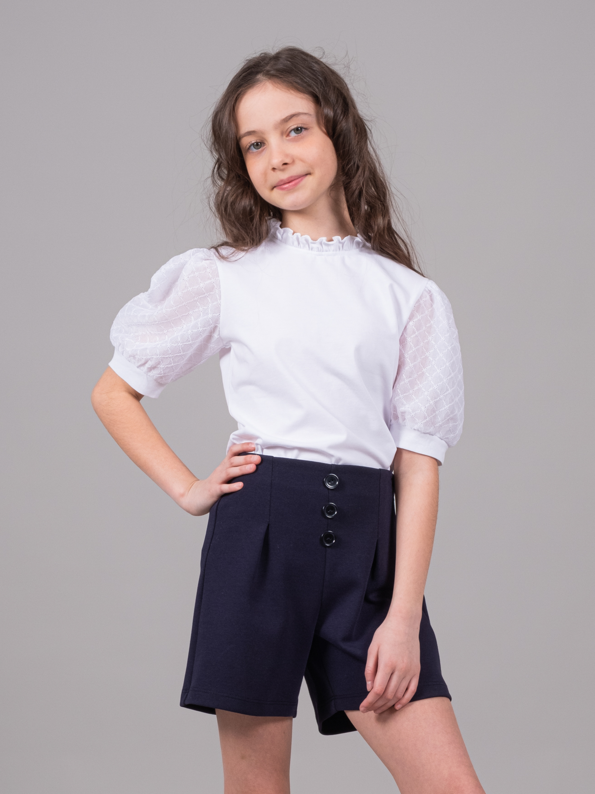 Блузка Dmb для девочек из хлопкового трикотажа оптом. Модель прямого силуэта украшена объемными рукавами-фонариками. Изделие не сковывает движения и отлично смотрится в любом образе.
