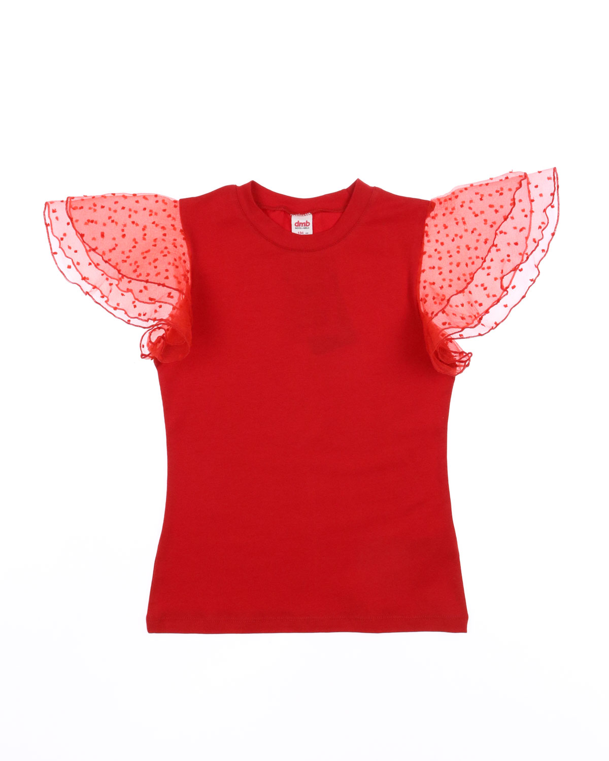 Нарядная футболка Dmb оптом выполнена из мягкого трикотажа приталенного кроя с короткими рукавами воланами из органзы.