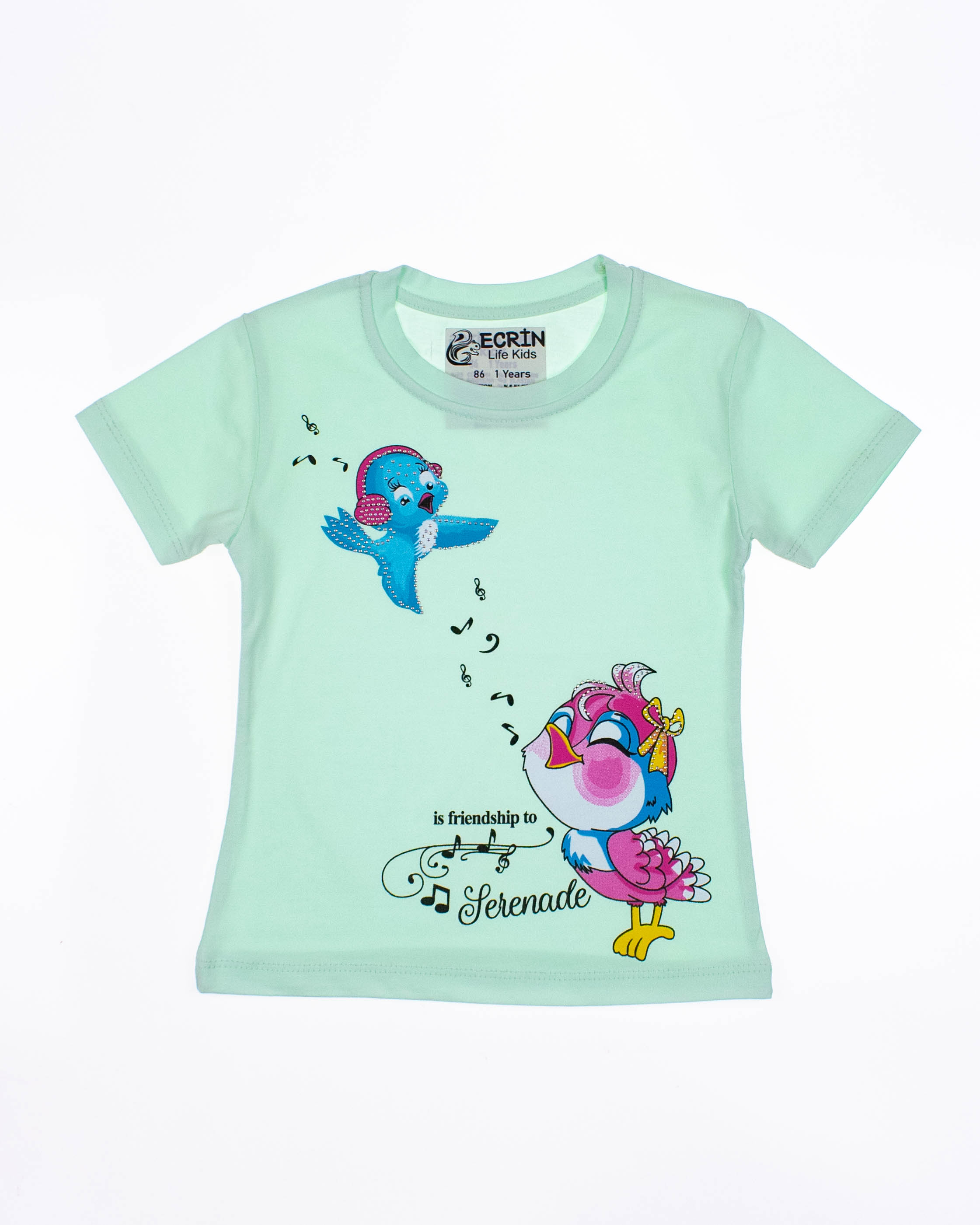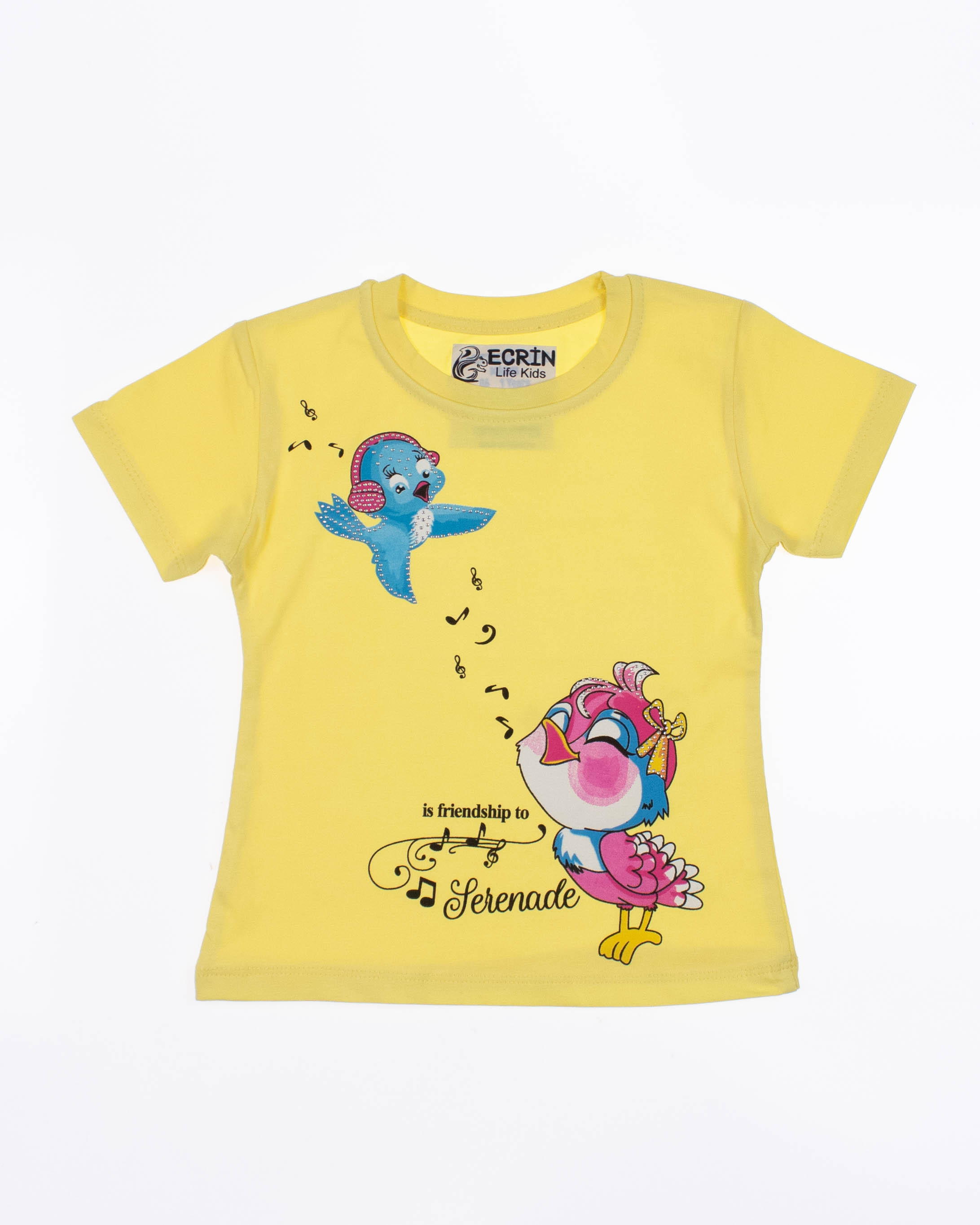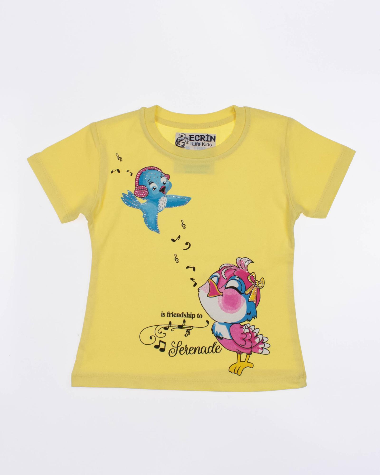 Футболка ECRIN для девочки оптом, производства Турция. Модель приталенного силуэта с короткими рукавами, милый принт украшен стразами.