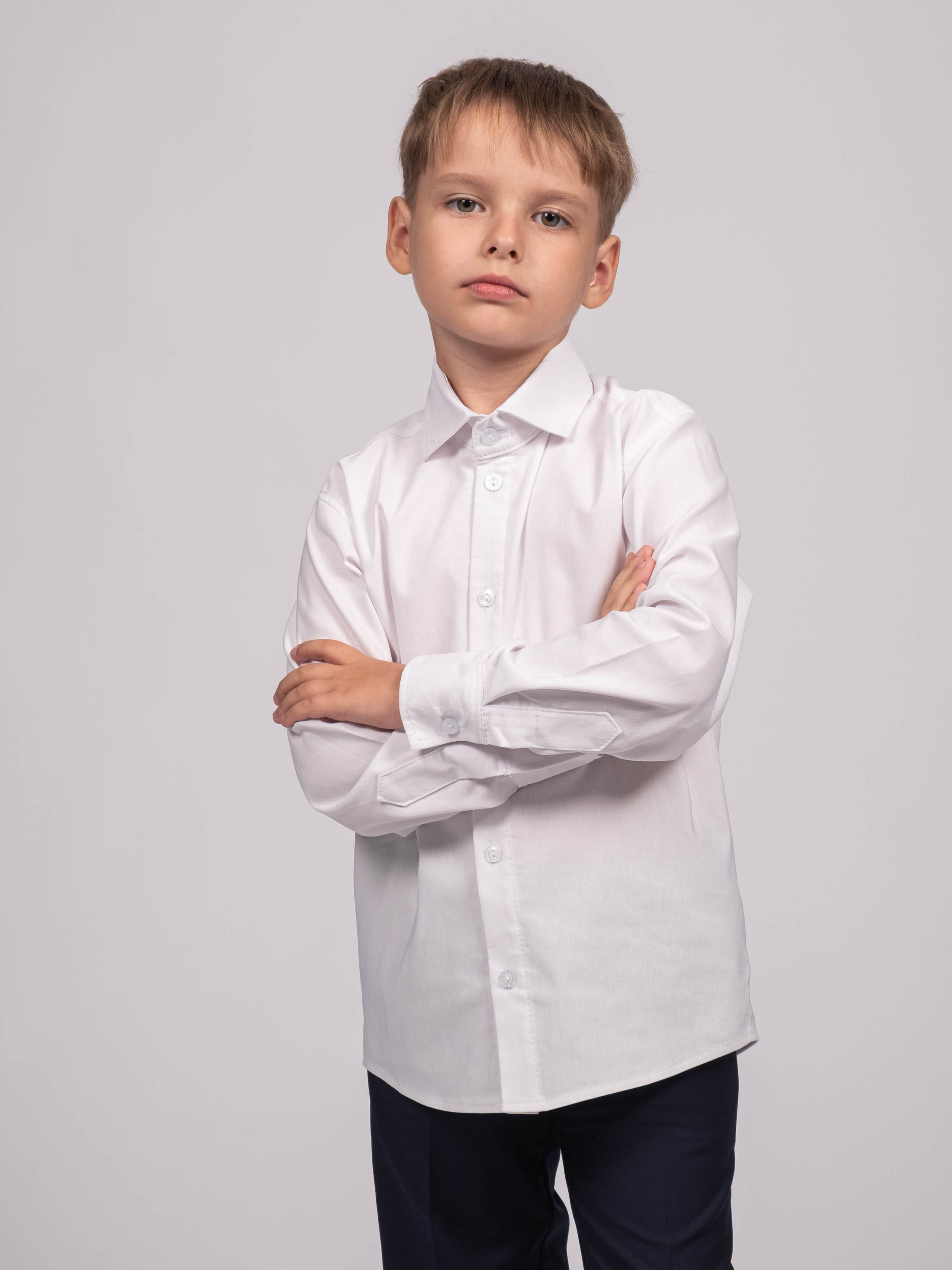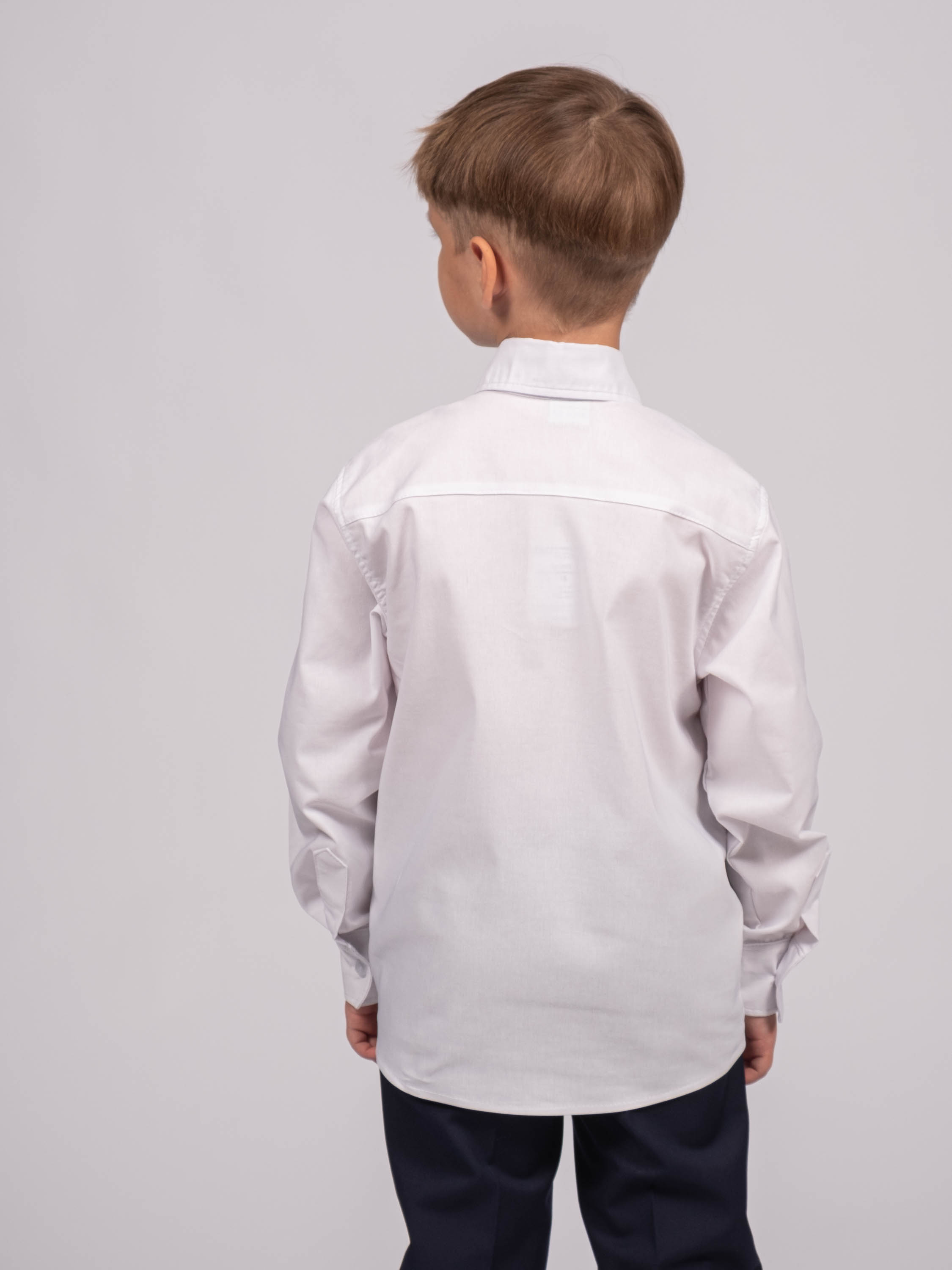 Детская однотонная рубашка для мальчика оптом. Рубашка изготавлена из смесового материала высокого качества. Модель застегивается на пуговицы.