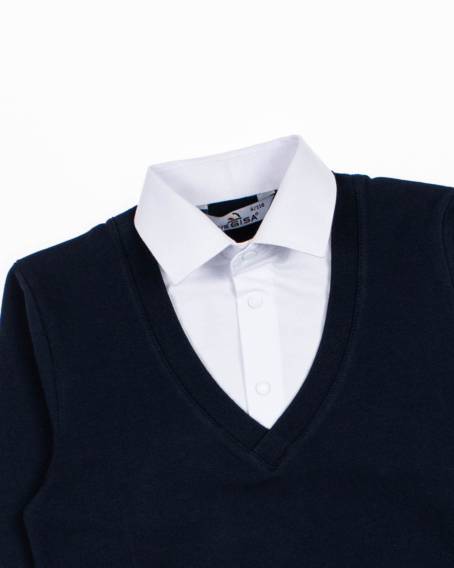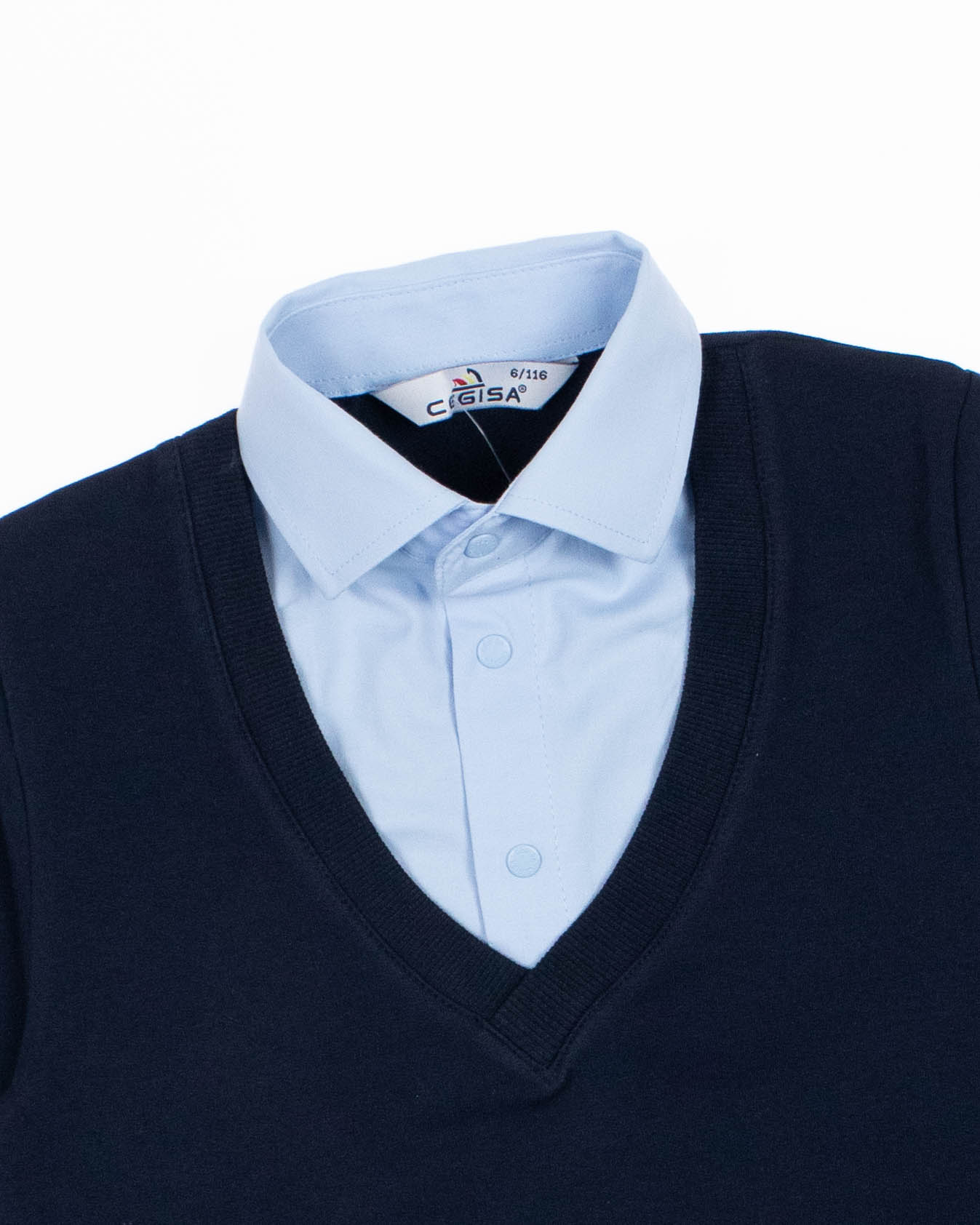 Школьный джемпер-обманка CEGISA для мальчика оптом с имитацией рубашки выполнен из качественного хлопкового трикотажа. Ворот сшит из рубашечной хлопковой ткани, застежка-кнопки.  Джемпер-обманка выглядит как полноценный комплект рубашки и джемпера. Мальчик будет всегда опрятен в школе, сохраняя при этом официальный дресс-код. Качество наших изделий подтверждают многократные стирки в стиральной машине, при которых джемпер-обманка сохраняет прежний вид, без деформации и окрашивания рукавов или ворота. Торговая марка  CEGISA представляет большой ассортимент качественной, красивой, классической школьной и спортивной одежды турецкого производства для детей и подростков.