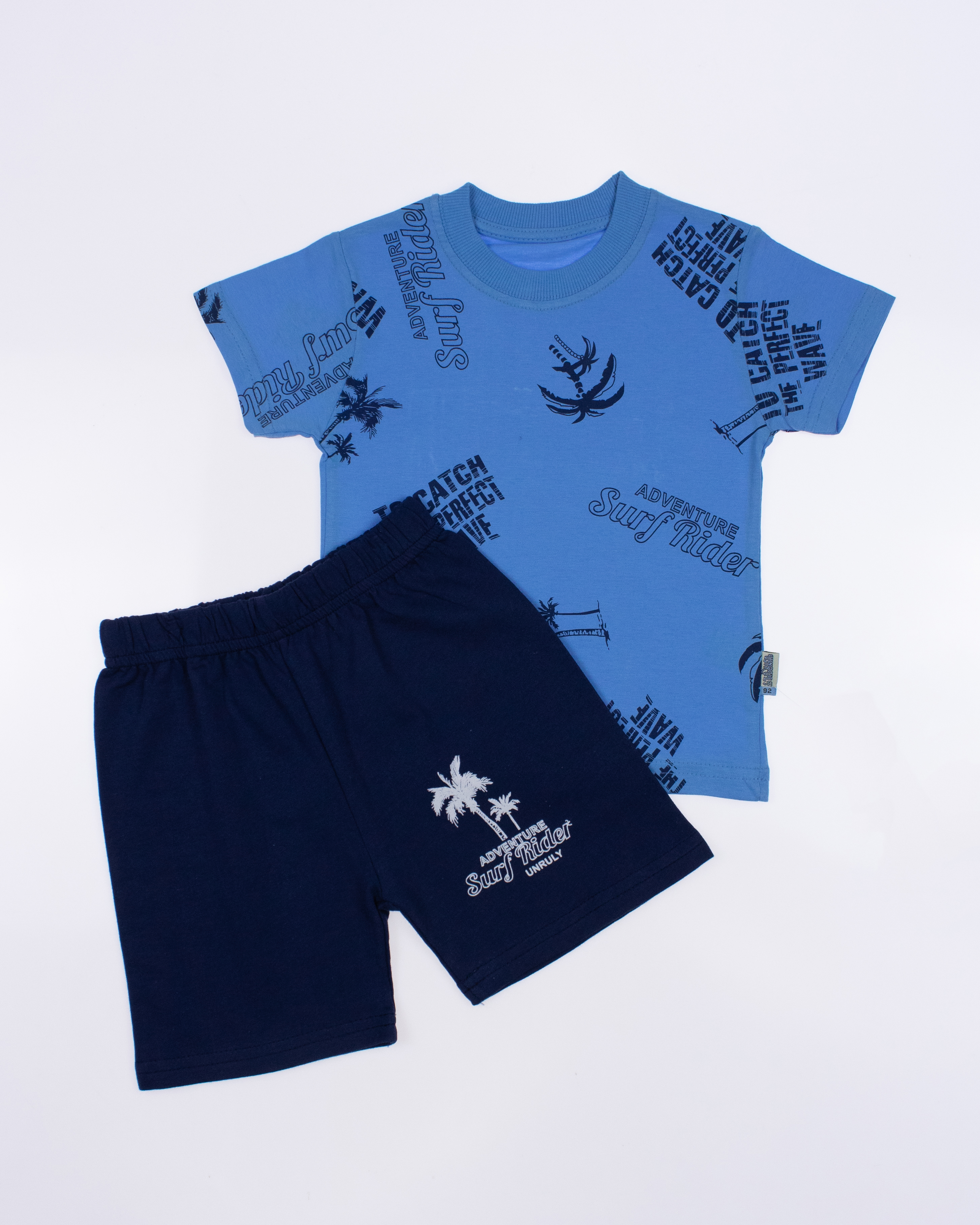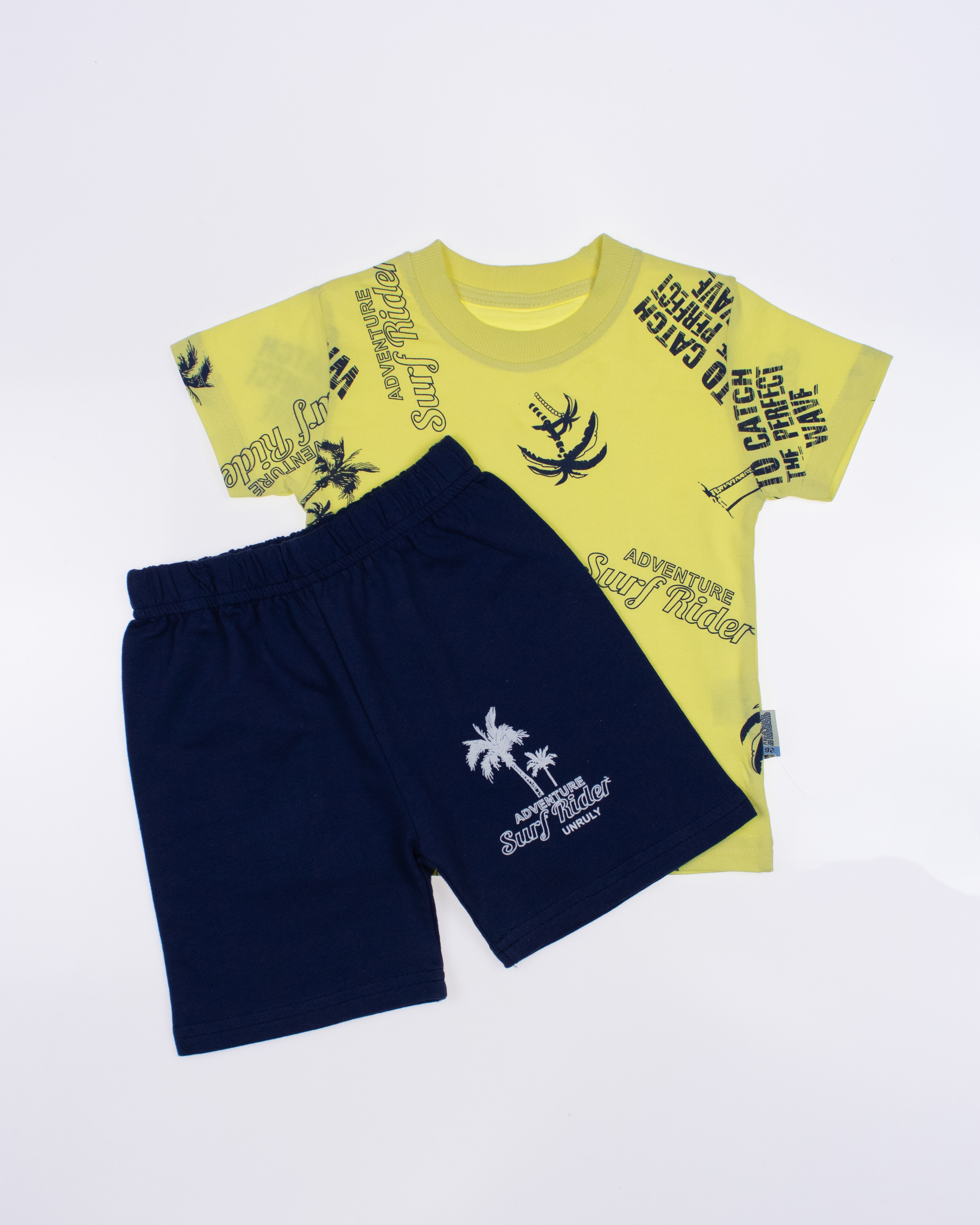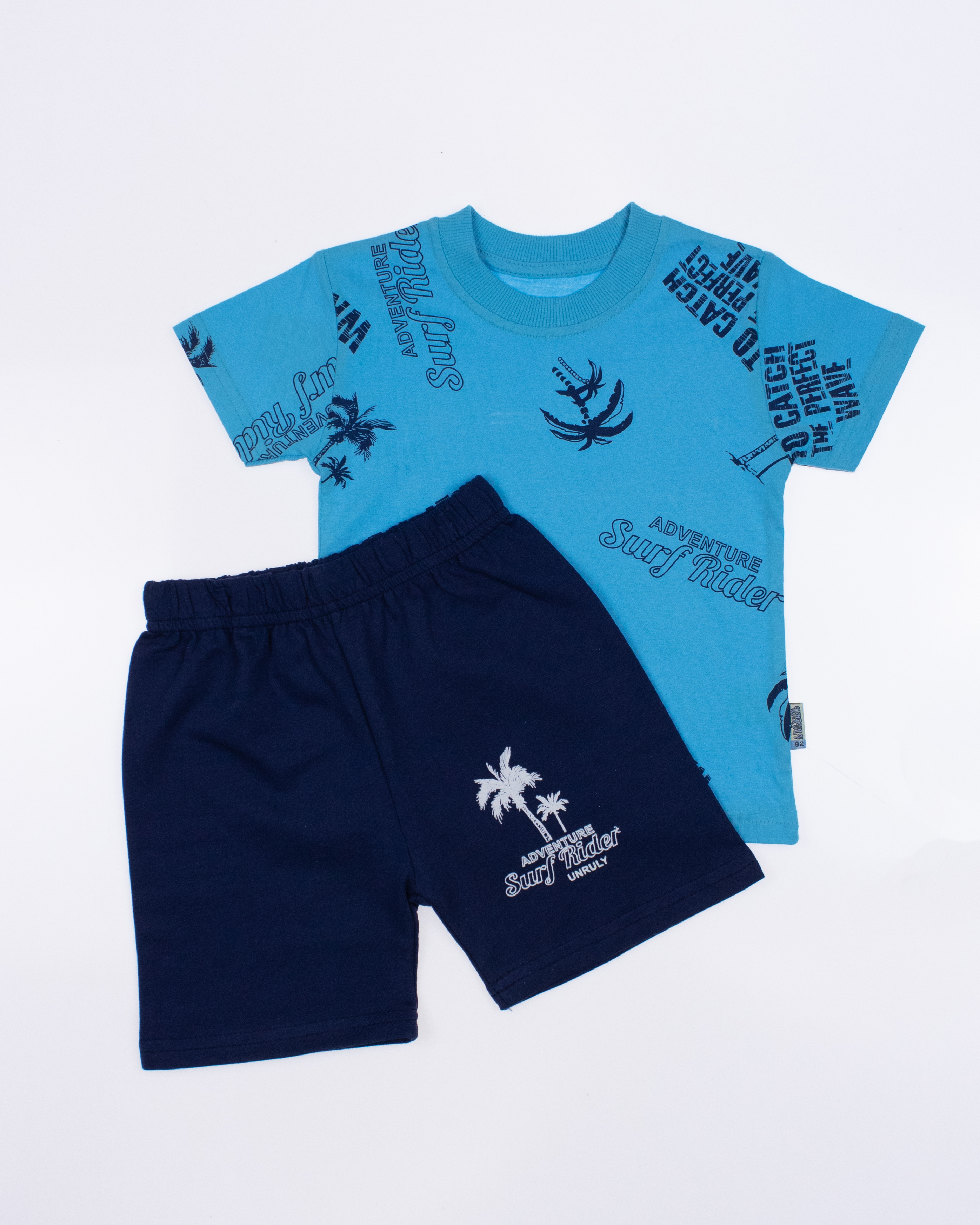 Костюм  Unruly для мальчика оптом, состоит из футболки и шорт. Модель выполнена из хлопкового полотна и оформлена печатным принтом. Футболка прямого кроя, с округлым вырезом горловины. Ткань кулирная гладь.