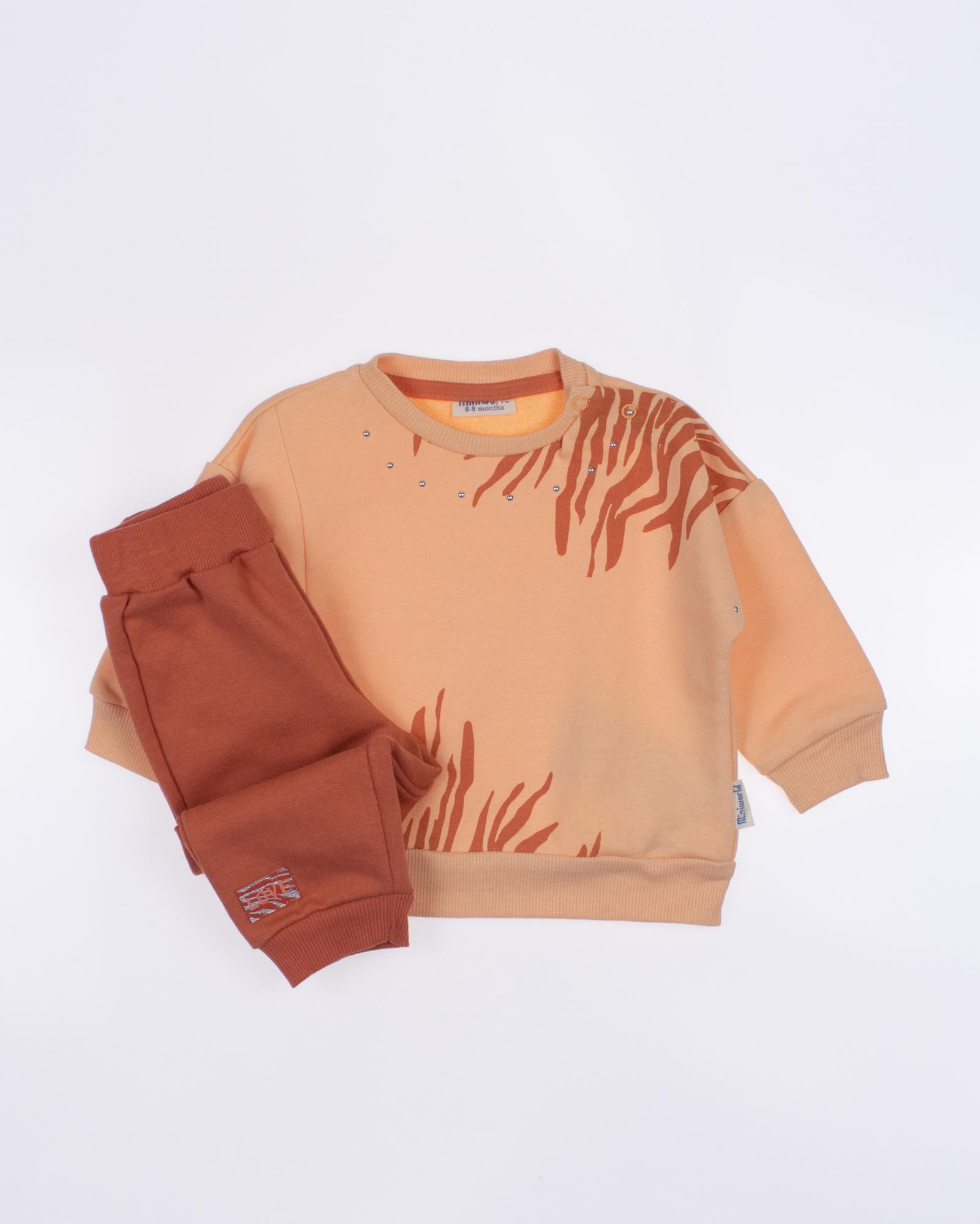 Мы предлагаем оптовые продажи детской одежды производства Турция. Хлопковый костюм  MINIWORLD выполнен из футера (петля), что гарантирует комфорт и безопасность для самых маленьких детей. Свитшот имеет удобную застежку-кнопки на плече, что облегчит процесс надевания и снятия одежды. Штанишки с мягкими манжетами на эластичном поясе идеально подходят для ношения с подгузником, обеспечивая свободу движений и комфорт. Детский милый принт на костюме поможет развить фантазию и воображение ребенка, делая его образ ярким и запоминающимся. Костюм MINIWORLD - отличный выбор для маленьких модников и их заботливых родителей. Не упустите возможность приобрести этот уникальный товар оптом по выгодной цене!