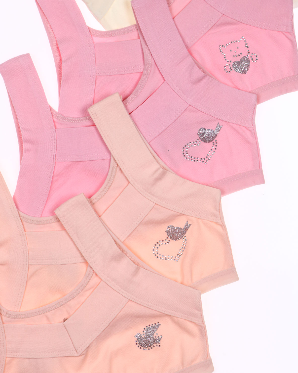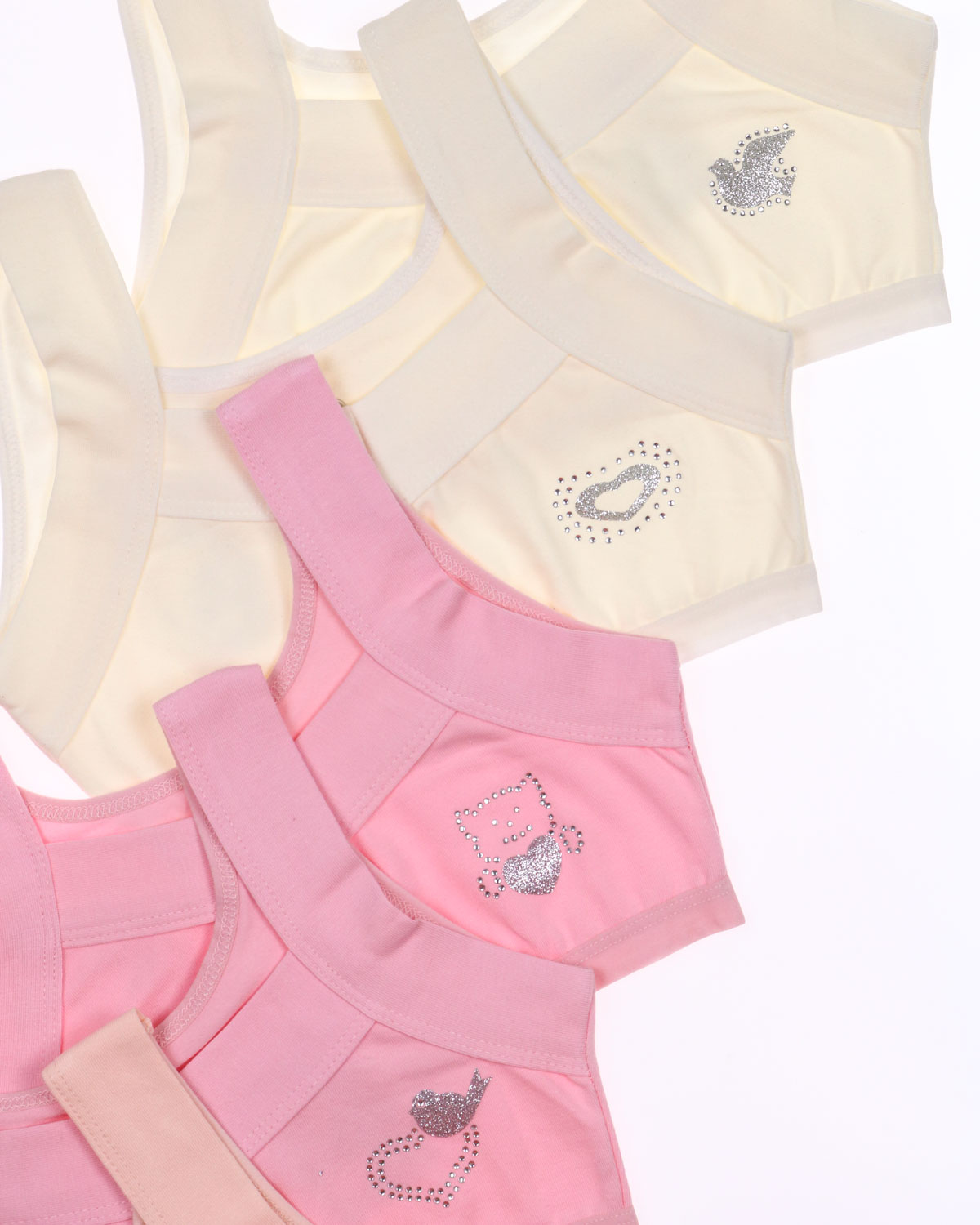 Бюстье для девочки изготовлено из кулирки гладкого, приятного к телу материала. Хорошо тянется благодаря добавлению эластана.   Бюстье для девочки очень комфортно для повседневной носки. Гипоаллергенная ткань приятно прилегает к телу, впитывая излишки влаги, пропуская воздух. Современная технология пошива обеспечивает изделиям высокие качественные характеристики и идеальный комфорт. Очаровательный дизайн и милый блестящий принт смотрятся невероятно нежно.