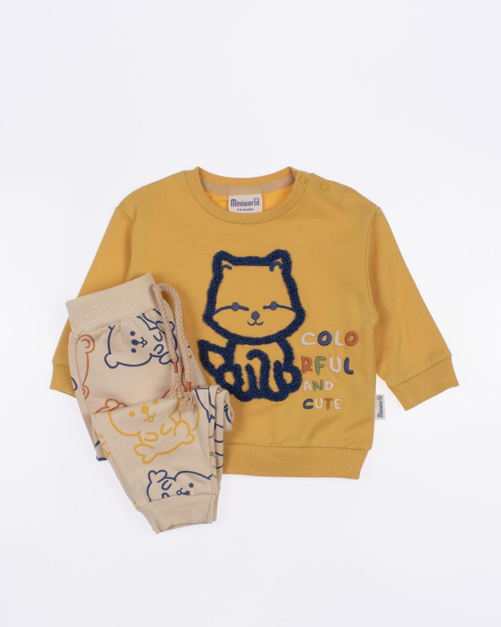 Мы предлагаем оптовые продажи детской одежды производства Турция. Хлопковый костюм  MINIWORLD выполнен из  хлопка с начесом, что гарантирует комфорт и безопасность для самых маленьких детей. Свитшот имеет удобную застежку-кнопки на плече, что облегчит процесс надевания и снятия одежды. Штанишки с мягкими манжетами на эластичном поясе идеально подходят для ношения с подгузником, обеспечивая свободу движений и комфорт. Детский милый принт на костюме поможет развить фантазию и воображение ребенка, делая его образ ярким и запоминающимся. Костюм MINIWORLD - отличный выбор для маленьких модников и их заботливых родителей. Не упустите возможность приобрести этот уникальный товар оптом по выгодной цене!